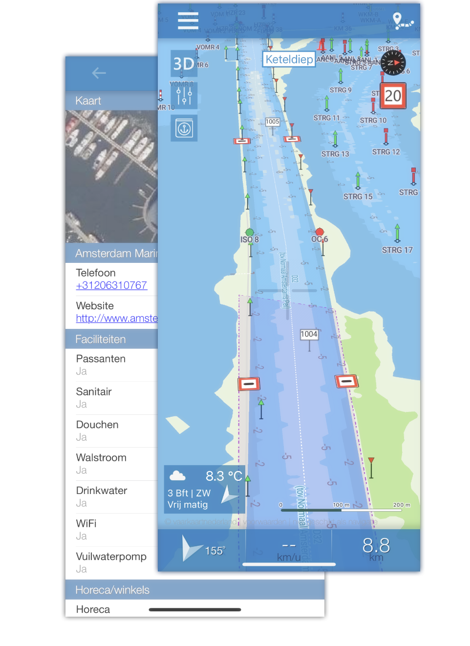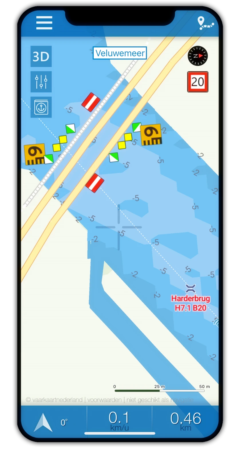 Tijdens het varen ziet u uw huidige positie, snelheid, koers en afgelegde afstand. Ook wordt er een koerslijn getoond met de verwachte aankomsttijd op basis van uw snelheid. Zo kunt u bijvoorbeeld makkelijk inschatten of u op tijd bij de sluis/brug bent voor bediening.