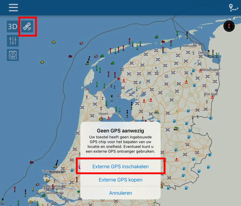 - Wanneer u de Vaarkaart Nederland app start kunt u de externe GPS koppelen door op het satelliet icoontje rechts boven te tikken en vervolgens de optie 'Externe GPS inschakelen' kiezen.